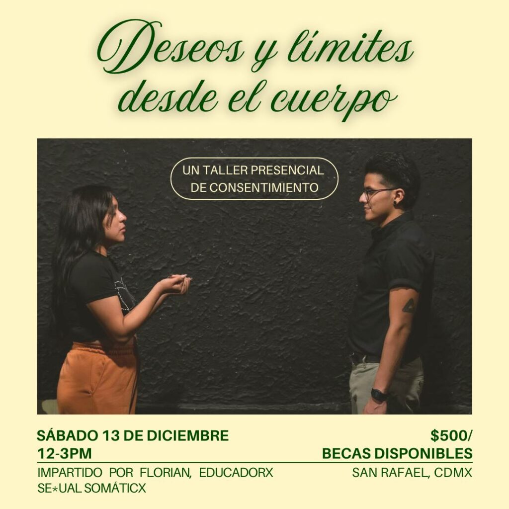 En esta clase teórica y práctica, exploramos cómo sentimos, desde nuestras sensaciones corporales, nuestros deseos y límites. ¿Cómo se siente un sí en el cuerpo? ¿Un no? ¿Un quizás? Vamos a explorar lo que queremos, lo que estamos dispuestxs a hacer, y la diferencia entre los dos. Propongo que regresemos a conectar con nuestras sensaciones corporales como brújula de nuestras necesidades y deseos. Vamos a practicar decir que no, vamos a practicar nombrar nuestros deseos, vamos a negociar y llegar a acuerdos. Voy a compartir la Rueda del Consentimiento (que prefiero nombrar la rueda de los acuerdos), una herramienta muy útil desarrollada por Betty Martin.